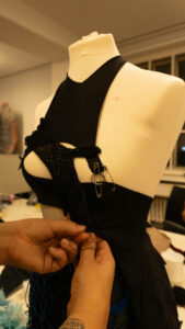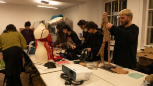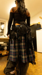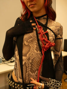 Der Workshop verlief Schritt für Schritt: zuerst das Material erkunden, es dehnen, schneiden, schichten und herausfinden, wie seine Spannung reagiert. Cindie führte die Gruppe durch einfache Schichttechniken und kleine Experimente, aus denen nach und nach individuelle Designs entstanden. Wir kombinierten Nylonstrümpfe mit verschiedenen Stoffen, verdrehten sie zu Accessoires, skulpturalen Details und improvisierten Silhouetten. Am Ende hatte jede*r einen eigenen Look kreiert. Wir verwandelten den Raum in einen kleinen Laufsteg, probierten unsere Outfits aus und hatten eine großartige Gelegenheit, über die Möglichkeiten des Upcyclings im Alltag nachzudenken.